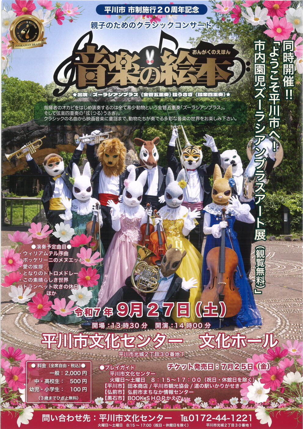 令和8年1月1日に平川市は施行20周年を迎えるにあたり、ファミリーコンサートを開催します。指揮者のオカピをはじめ演奏するのはすべて希少動物という金管五重奏「ズーラシアンブラス」。そして弦楽四重奏の「弦(つる)うさぎ」。