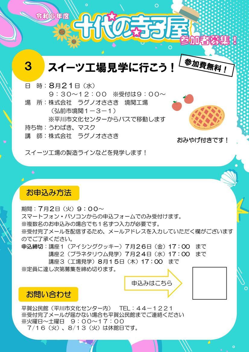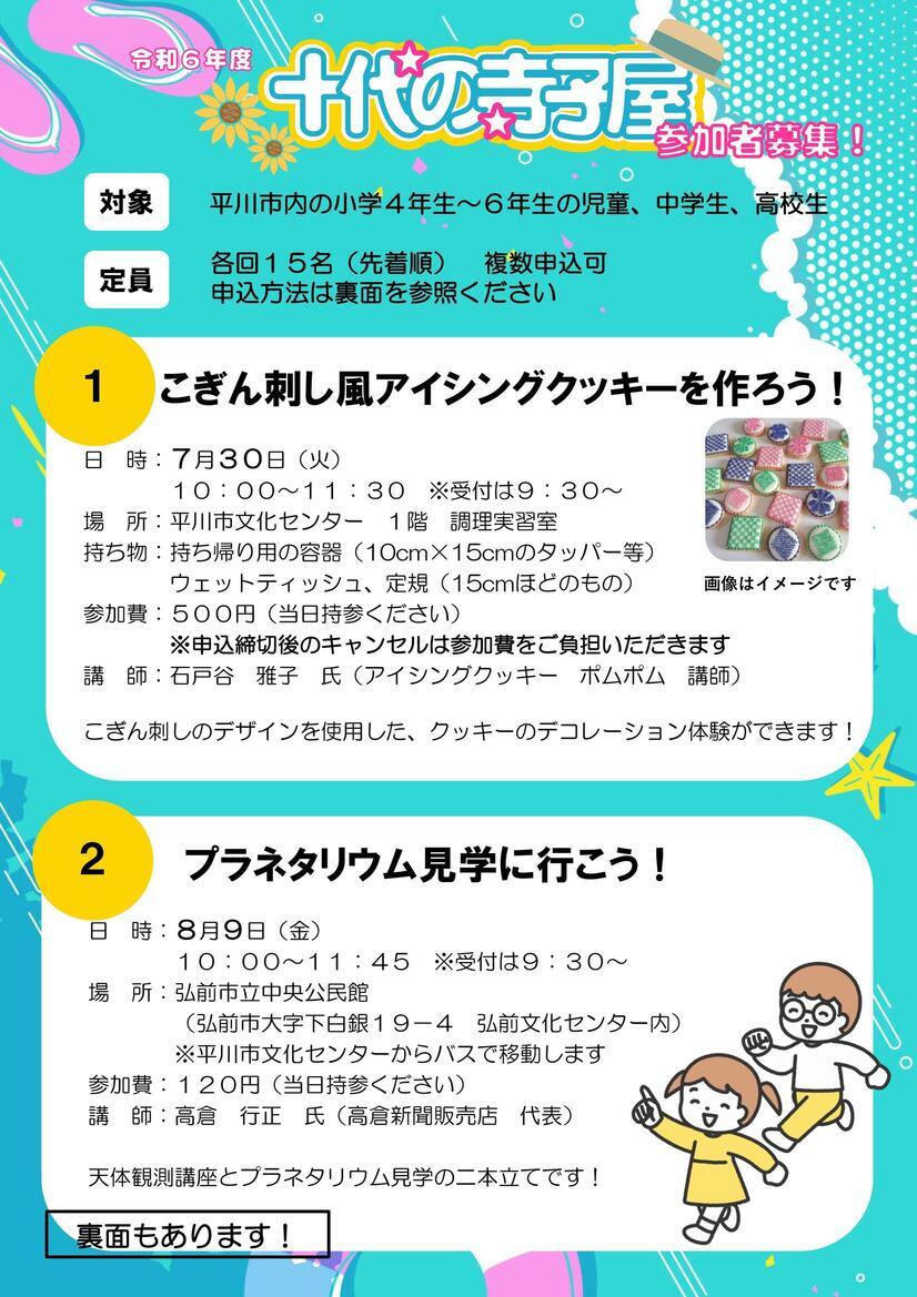 平川市では、市内の小学校高学年から高校生を対象に、文化・暮らし・食育などの体験講座を夏休み期間中に3講座実施します。