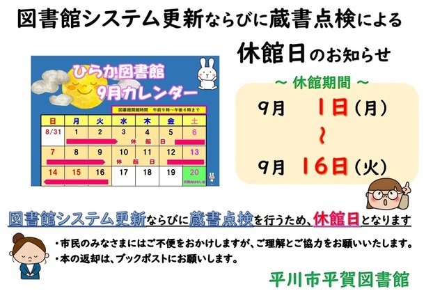 平賀図書館では「図書館システム更新」ならびに「蔵書点検」を行うため、下記期間は休館となります。