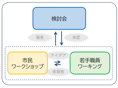 次に「市若手職員ワーキング」において、庁内の関連計画との連携可能性について検証等を行ったうえで、有識者や市内団体、事業者等で構成させる「検討会」に報告、承認を行っていただき、最終的にパブリックコメントを実施し、一般の方のご意見を反映させた後に基本構想として取りまとめることとしています。